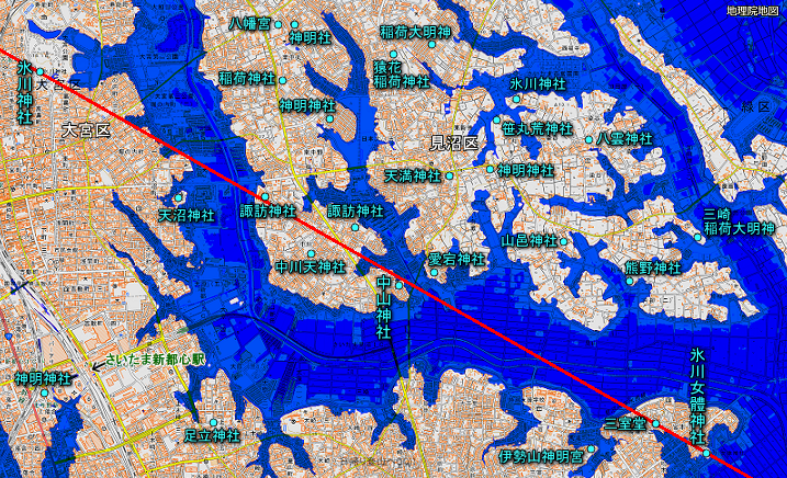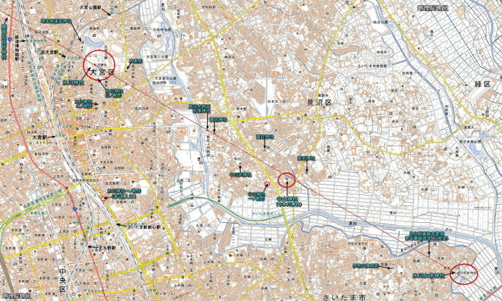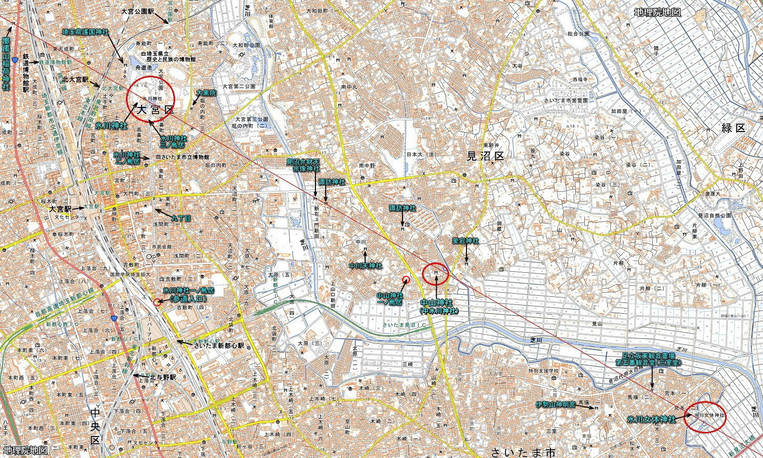 ![]() 氷川神社レイライン 中心部 ↑クリックで拡大します↑ 武藏国一之宮 氷川神社~中山神社(中氷川神社)~氷川女體神社 |