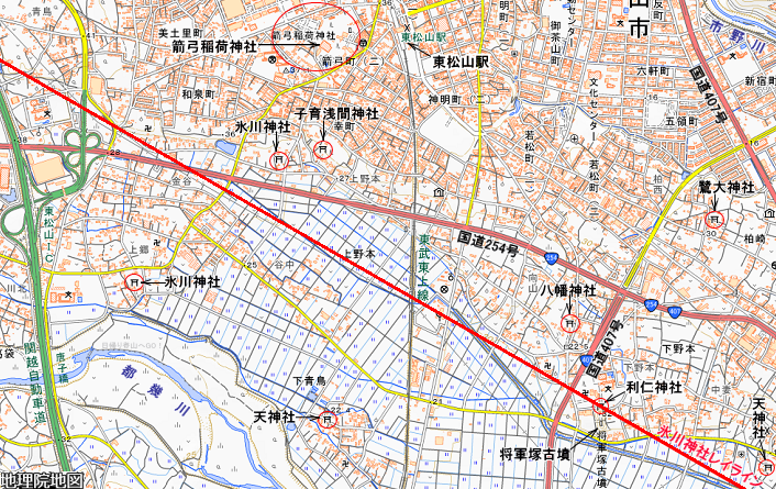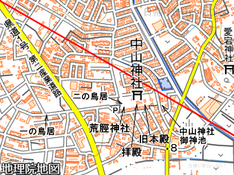 氷川神社・中山神社・氷川女體神社(ひかわにょたいじんじゃ)は、一本の直線で繋がる。