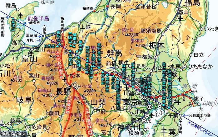 ![]() 氷川神社レイラインも、鹿島神宮レイライン同様、構造線と絡んでいる。 特に埼玉県内においては、推定されている中央構造線と氷川神社レイラインは、かなり絡んでいるようにみえる。 氷川女體神社は、中央構造線が東へと進路を変えるポイントか? また、氷川神社から千葉市の辺りまでは、柏崎-千葉構造線とも絡んでいるようにみえる。 そして、このラインは明らかに熊野修験との関わりが見てとれる。 氷川神社本殿を起点として南東端の千葉県九十九里町の片貝海岸まで約86㎞。 北西端の石川県輪島市門前町北川の海岸まで約299㎞。 端から端までの総距離約386㎞。 レイライン南東端の片貝海岸と北西側・富山湾に流れ出る片貝川の「片貝」つながりは偶然なのか? 北東方に向かって延びるような形の能登半島と、南西方に向かって延びるような形の房総半島が対照的に見えるのも面白い。 |