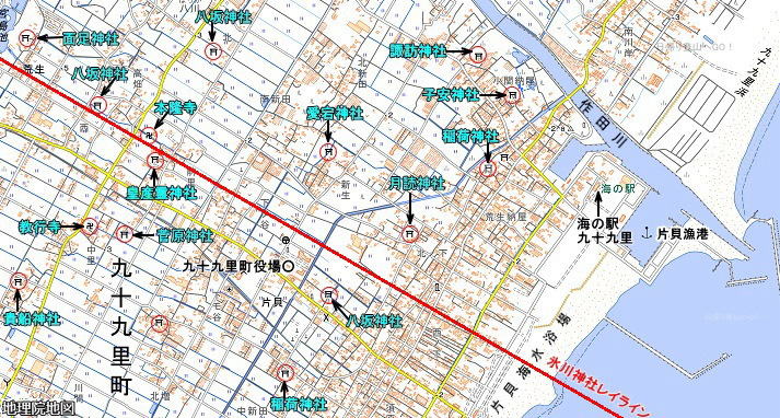 ![]() 千葉県山部郡九十九里町 (氷川神社レイライン南東端) 町の区画が氷川神社レイラインの向きと同じ。 氷川神社レイラインの向きは冬至の日の出の方角なので、この地域も同様に冬至の日の出の方角を意識して 区画を整理したのか?それとも氷川神社レイラインをも意識して作られた町なのか? たまたま海岸線の向きが、冬至の日の出方向を向いていたため、海岸線に向かって垂直に道を敷いたら冬至の日の出方向になったのか? 九十九里町役場がレイラインに近いのは偶然か? 戦後の区画整理によるものだろうか? 九十九里の漁港は江戸時代に紀州(和歌山県)和歌山市加太(かだ)の漁民が開いたといわれる。 「片貝」という地名は「加太」からきているという説もある(「加太」の海=「加太海(かだかい→かたかい」⇒かたがい)。 氷川神社レイラインにおいて紀州と言えばスグに熊野=熊野修験が思い浮かんだのですが、和歌山市の加太と熊野三山では同じ紀州でも結構距離が離れている。はたしてどうなのかなと思いとりあえずネットで調べてみると、意外にもスグに加太と熊野修験の関係がヒットした。 なんと、加太の友ヶ島の序品窟(じょほんくつ)(👉グーグルマップ)は熊野修験葛城二十八宿修行の出発点だった!(葛城二十八宿は修験最古の道で、熊野古道もここから派生したという。) ちなみに、九十九里のレイライン付近にある神社は大きな神社ではない。 氷川神社から片貝海岸まで約86㎞ |