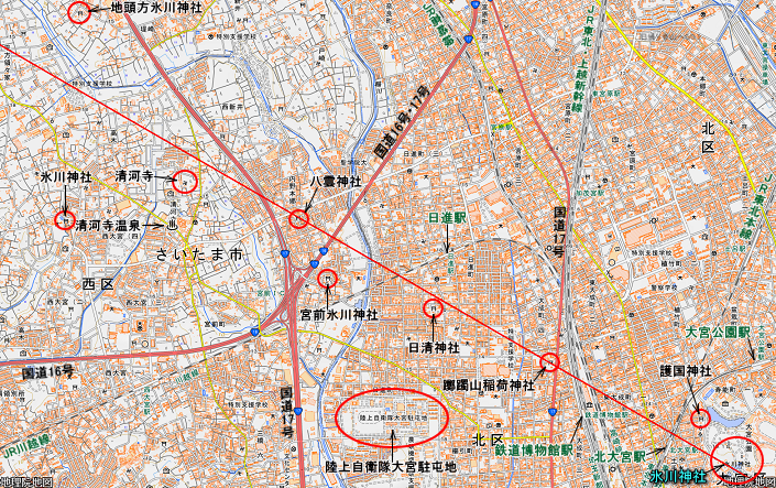 さいたま市北区・西区![]() 氷川神社北西側のレイライン付近には鎮守の氷川神社が多数ある。 こちら側の自衛隊施設はライン上ではないが、ラインに近い。 さいたま市西区高木の氷川神社(鎮守)の境内に祀られている杓文字様は 縄文石棒の可能性がある。 |