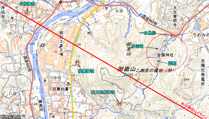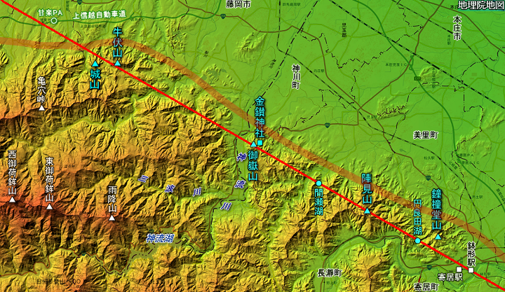 御嶽山と武蔵国二ノ宮の金鑚神社(埼玉県児玉郡神川町)![]() 御嶽山山頂をもろに通過している。この山の北東麓には武蔵国二ノ宮である金鑚神社がある。 金鑚神社は拝殿のみで、その背後の山を御神体として祀る、古い神社形態が残る珍しい神社。 この形態の古社は奈良県桜井市の大神神社(おおみわじんじゃ)-三輪山、長野県諏訪市の諏訪大社上社-守屋山、そして当神社-御室山(御室ヶ嶽)の3社だけという。 金鑚神社も縄文時代の祭祀場・居住地跡か? 御嶽山南西方にある三波川流域は縄文石棒の生産地の一つとされ、神流川や荒川を利用し水運によって各地へ石棒を運んでいる。 この辺りで産出された石質の石棒が、遠く茨城県の鹿嶋からも出土している。 ☞ 石棒のページ(日帰り登山へGO!) 氷川神社から御嶽山山頂まで58.3㎞、金鑚神社まで約58㎞。 ☞ 御嶽山(金鑚神社)のページ(日帰り登山へGO!) |