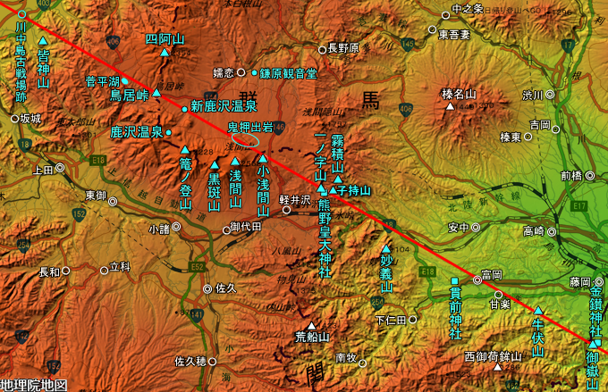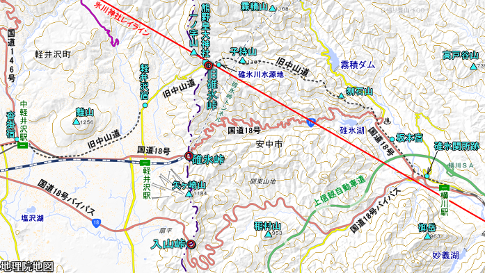![]() 1⃣古代から中世初期は碓氷坂と呼ばれ(当時は峠と呼ばれていない)、現在の入山峠(国道18号バイパス=碓氷バイパス)にあった。当時は東山道(古東山道)が通る。〈群馬県安中市松井田町入山/長野県北佐久郡軽井沢町長倉〉 また、入山峠には祭祀遺跡があり、縄文時代晩期から平安時代までの各時代それぞれの遺物が出土している。 氷川神社本殿から98.8㎞。 2⃣中世から近世(鎌倉期~明治初期)の碓氷峠は中山道にあった。現在の旧碓氷峠・旧中山道。熊野皇大神社のある峠。〈群馬県安中市松井田町峠/長野県北佐久郡軽井沢町峠町〉氷川神社本殿から100.9㎞。 3⃣明治十六年(1883)に国道18号が開通してからは、この国道の群馬・長野県境の峠が碓氷峠となる。〈群馬県安中市松井田町坂本/長野県北佐久郡軽井沢町軽井沢〉 氷川神社本殿からほぼ100㎞(100.09㎞)。 これは氷川神社を軸にしているのが明らかだ。偶然では無いだろう。 この国道の建設にあたっても八咫烏が関与しているのか? |
