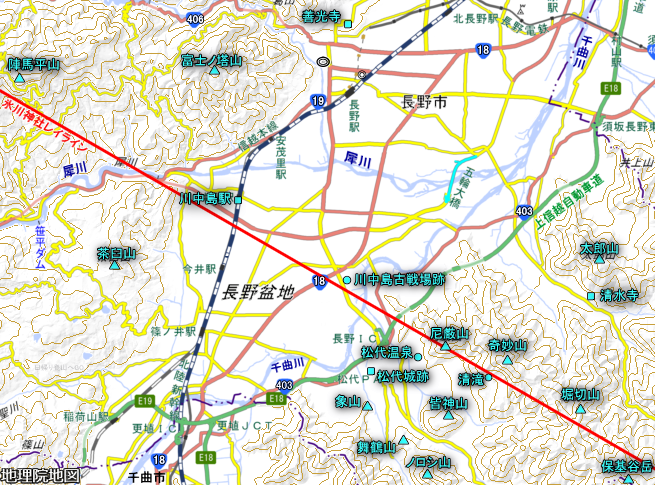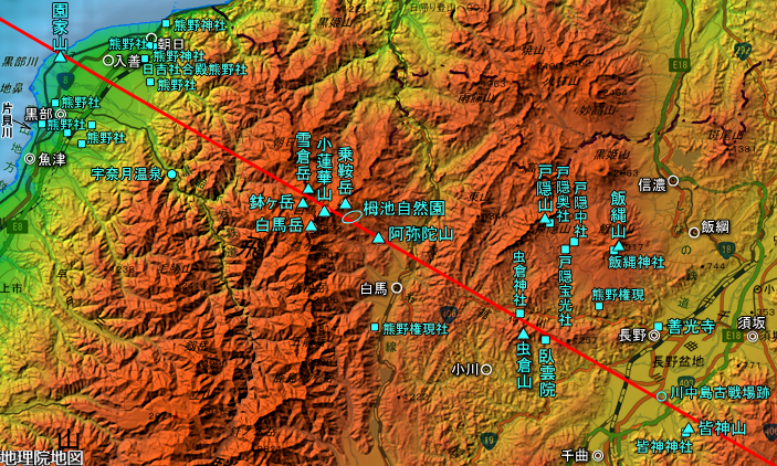 ![]() 長野盆地(善光寺平ぜんこうじだいら)へと抜ける手前、レイライン付近に皆神山(みなかみやま)がある。この皆神山は有名なミステリースポットだ。山頂には皆神神社(熊野出速雄神社)が鎮座している。 まさか氷川神社レイラインがそばを通っていたとは! その先、長野盆地へ入ると、上杉謙信と武田信玄が戦った川中島古戦場跡を通過(実際の戦場地はもう少し西の辺りらしい)。 川中島古戦場跡からほぼ真北には善光寺がある。その距離7~8㎞(計測地点によっては7.77㎞のゾロ目!)。善光寺や戸隠山は熊野修験と関わりがあることが知られている。 レイラインは長野盆地から再び山間部へと入って行く。 善光寺地震※3の震源域にあたる虫倉山の北側を通り、北アルプス北部の乗鞍岳と小蓮華山の間を抜け、海岸近くの低山・園家山(標高17.2m)の北側を通り富山湾へ出る(富山県下新川郡入善町)。 富山県入善町/黒部市の境を流れる黒部川は、レイラインの南側をラインに平行な形で流れ、富山湾に注いでいる。 また、その黒部川河口の南約6.7㎞に、片貝川河口がある。 レイライン南東端にある千葉県・片貝海岸との「片貝」つながりは偶然なのか? 調べてみると片貝川河口付近に熊野社が5社鎮座していた。 こちらの「片貝」もきっと熊野修験と関係あるな。 ちなみに、レイラインを挟んで反対側にも熊野社が5社鎮座している。 皆神山まで約145㎞、川中島古戦場跡まで約149㎞。 レイラインから離れるが、善光寺まで約153㎞、飯縄山まで約162㎞、戸隠山まで約170㎞。 阿弥陀山まで約185㎞、小蓮華山まで約191㎞、乗鞍岳まで約190㎞、園家山まで約226㎞、黒部川河口まで227㎞。 ※3 善光寺地震:江戸時代後期の弘化四年(1847)、長野県北部で起きた大地震。M 7.4。震源域は長野市から飯山市にかけての広範囲に及ぶ。当日は善光寺の如来開帳で大勢の人が訪れていたため善光寺町の被害は甚大だった。全壊焼失家屋は約20,000戸で、総死者数は8,000人を超えた(善光寺領では約2,400人)。山崩れも多数箇所で発生し、犀川では川がせき止められ村が水没、その後せき止められた川が決壊し、流出・押理・潰家屋は3,000戸を超えた。 |