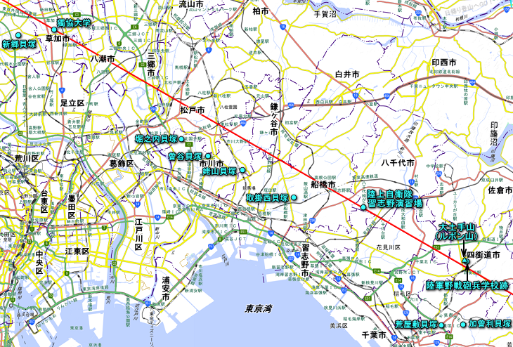 ![]() 陸上自衛隊習志野演習場と獨協大学がもろにレイライン上。 氷川神社から獨協大学まで17㎞前後、陸上自衛隊習志野演習場まで46㎞前後。 片貝海岸から陸上自衛隊習志野演習場まで40㎞前後、獨協大学まで69㎞前後。 大土手山(ルボン山)もレイラインに絡んでいるといって良いと思う。 大土手山(ルボン山)は旧陸軍の砲兵射垜(ほうへいしゃだ:砲撃の的をかけておく築地)で、かつてこの辺りは軍の演習地であり、江戸期には佐倉藩の火薬場があったらしい。 貝塚の場所が氷川神社レイラインとほぼ平行に並んでいるのも気になる。 これらの貝塚を結ぶラインは、縄文時代の海岸線だろう。 氷川神社レイラインに重なるか沿ったかたちで柏崎-千葉構造線が通っていると思われる。 |