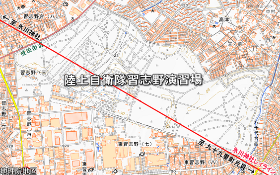 習志野市![]() 陸上自衛隊習志野演習場はレイラインがもろに通過している。 かつては習志野原という地名で、明治の頃から旧陸軍の射撃場なんかがあった場所だ。 さらにその前、江戸期以前は広い原野だったという。 明治政府は氷川神社レイラインを知っての上で、ここに軍の施設を置いたのか? 氷川神社のパワーを得ているのかな? |