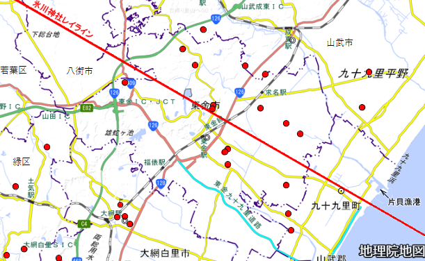 レイライン付近の熊野神社(●印) 九十九里町・東金市周辺![]() |