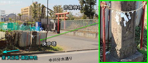 ![]() 宗像神社のそばにある庚申塔は寛政八年丙辰十一月吉日 奉納。(寛政八年=1796年) すぐ横にある台地上に諏訪神社があるのですが(宗像神社から直線距離にして120mほど)、少し遠回りしなければ上へ上がれません。 (江戸時代の頃は直接台地上の諏訪神社へ上がる石段でもあったかも知れない) |