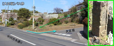 ![]() 大正坂を上がります。(「大正坂」バス停付近) 大正時代に設置された石標があります。 石標には「大正道 大正二年三月竣工」と刻まれている。(大正二年=1913年) (庚申塔から約100mの地点) |