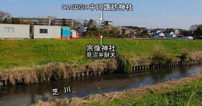 ![]() 宗像神社(見沼辨財天) 台地の際の下側に鎮座。 (台地と低地の境の低地側) 少し離れた所に芝川が流れています。 (諏訪神社はスグ横の台地上にあります) |