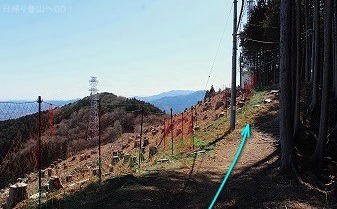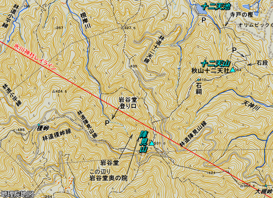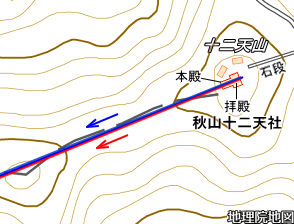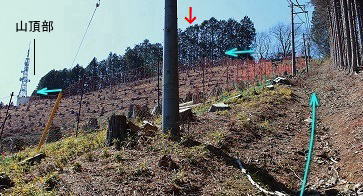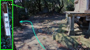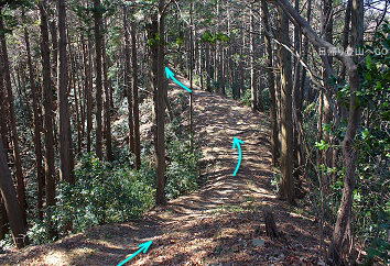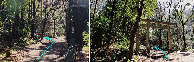 ![]() ㉔車道を横切り登山道へ入る。山頂までもう少し。 赤矢印の辺りが氷川神社レイラインが通る地点。 |