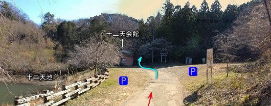 ![]() ①十二天池の横に駐車場。ここから登りました。十二天社まで徒歩約30分。 (コンクリート道をさらに進んで上のほうの駐車場へ行くこともできるが道幅狭し) |