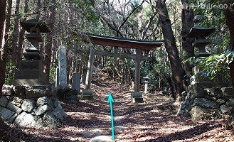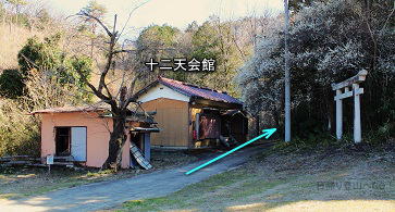 ![]() ②十二天会館前を通るコンクリート道を登って行きます。 ちなみに道の脇にある石鳥居をくぐっても道はありません(草木が繁茂)。昔はこちらが参道だったのだろうか。 それとも車道を通す際に鳥居を横に移動させたのか? |