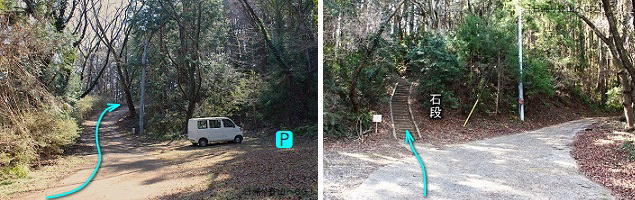![]() ⑤この駐車場のもう少し先に十二天社への石段が現れます。「十二天参道」の看板が立っています。 (十二天池の駐車場から約15分) 〈ここからさらにコンクリートの車道を上がって行くと一番上の駐車場(石段参道の中段辺り)。道幅狭い〉 |