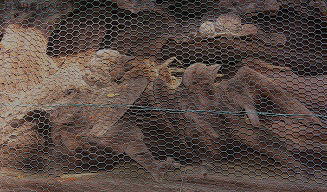 ![]() ⑫左下にいる2羽?のカラス天狗(小天狗?)が 上の方にある何かを見ている。 何があるのか?よく見えない。 右下には天狗のウチワを持った 修験者らしき人(大天狗?)がいる。 何かの物語の様子が刻まれていると思われるが、 金網が邪魔してよく見えない。 |