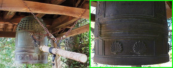![]() ⑭梵鐘もあります。天狗のウチワが陽刻されている。 鐘に刻まれている文字:「関東霊場 秋山十二天」「具一切功徳慈眠視衆生」「福聚海無量是故應頂礼」「昭和二十七年十月吉祥日」 (昭和二十七年=1952年 ) 具一切功徳 慈眠視衆生 福聚海無量 是故應頂礼 (『妙法蓮華経』観世院菩薩普門品第二十五偈 「観音経」) |