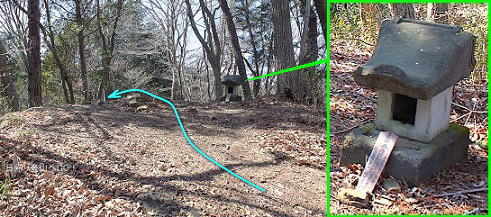 ![]() ⑳石祠がある小峰を乗り越える。 石祠と熊野修験の木札 標高410m |