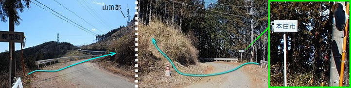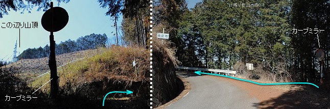 ![]() ㉑車道(林道陣見山線)に出る。(カーブミラーと本庄市/美里町の境界標識があります) ここは右へ進む。カーブを曲がったところの左側に陣見山への登山道(道標アリ・下写真㉒)。 |