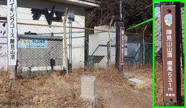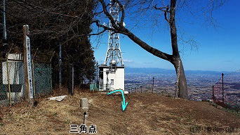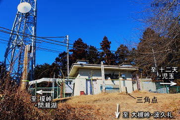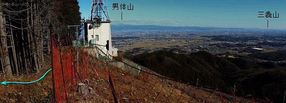 ![]() ㉖山頂の少し下にあるアンテナ棟の横を通過。このアンテナ棟の北側辺りからのほうが、 山頂からの展望より少し広い展望が得られます。(山頂からだと赤城山が見えない) |