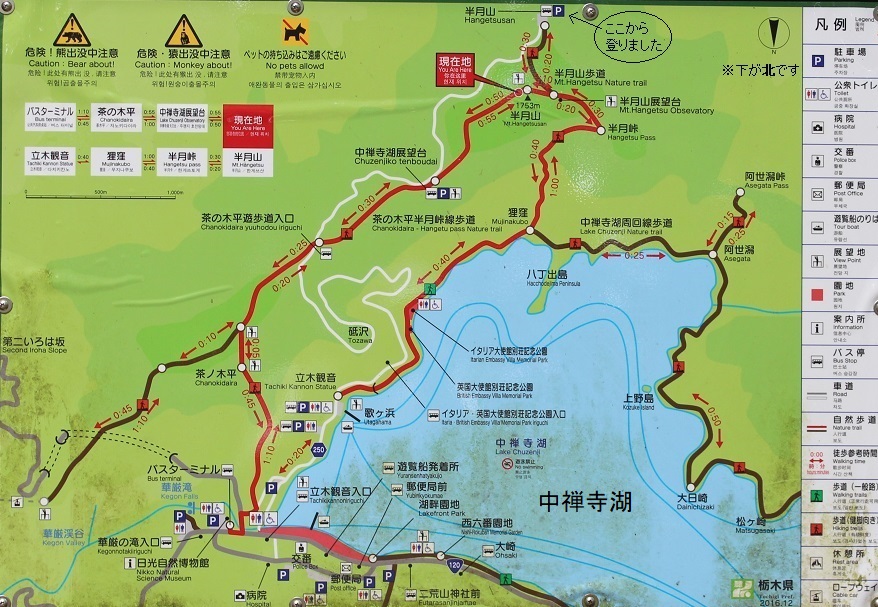 ○中禅寺湖展望台(第一駐車場)からも半月山への登山道あります(頂上迄約1時間)。冬季は県道250、閉鎖されています(4月中旬頃まで)。立木観音から湖畔沿いに半月山へ向かうルートもあります。