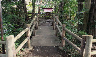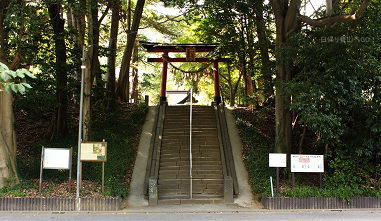 ![]() ②石段の下から見た氷川女體神社の鳥居。 (氷川女體橋からから見た様子) 氷川女體神社は台地の上に鎮座している。 ここを氷川神社レイラインが通っている |