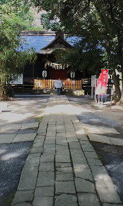 ![]() ⑥拝殿に向かって まっすぐ延びる石畳。 ほぼこの方角に 中山神社と 氷川神社がある。 夏至の頃の日の入りの方角 |