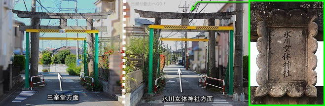 北西方面へ500mほど歩いて行ったところに女體神社の参道鳥居があります。
