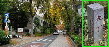 ![]() ③「九丁」丁石 長い参道の中間地点の丁石。大宮小学校の東門前にあります。 |