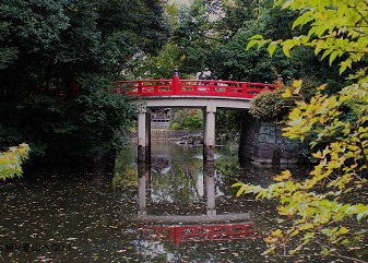 ![]() ⑨神橋の上から 神池に浮かぶ宗像神社を望む。 池には亀や鴨、鯉などがいる。 時々カワセミもいる。 |
