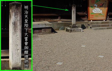 ![]() ⑱「明治天皇陛下大嘗會御饌埋納地」 と刻まれた碑がレイライン上に立っている。 「饌」とは、ごはん・お膳立てした食べ物・ ごちそう・お供え物の意。 埋納地とあるから、ここに埋めたのだろう。 明治天皇が埋めたのだろうか? 不思議な儀式だ。 地面に正方形の4つの石が 四角く配置されているのは何だろう? |
