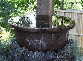 ![]() ㉓水鉢 龍の姿がが陽刻されていて 水は静かにしたたっている。 水面は鏡のようだ。 手水と蛇の池入口の間にあります |
