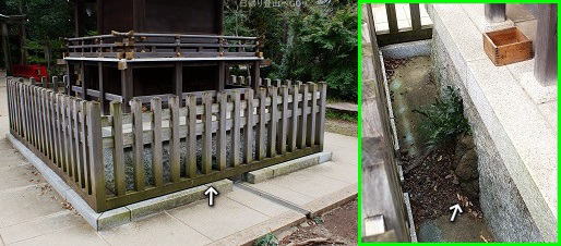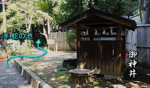 ![]() ㉔御神井 手水と蛇の池入口の間にあります。 (中を覗いたら地下水をくみ上げるポンプの機械があった) |