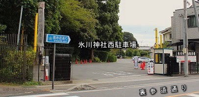 ![]() ㉞氷川神社の裏(北西)側に廻って裏参道通りに出る。 氷川神社の西駐車場出入口の辺り。 ちょうどこの辺りに氷川神社レイラインが通っている。 (氷川女體神社、中山神社、氷川神社を結ぶ直線のレイラインは、氷川神社本殿を通ったあと、このあたりから神社境内を抜け出て真っすぐ北西方面、碓氷峠へと向かう。) |