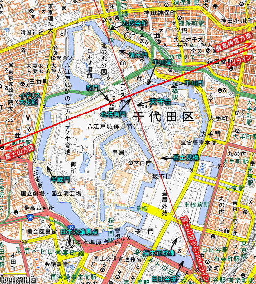 ![]() 皇居 レイラインは平川濠、北桔橋門の前、乾門を横切り、吹上大宮御所付近を通って皇居を抜け、英国大使館をも通過。 江戸城の正門ともいわれる半蔵門も近い。 (レイラインを幅広の帯=ベルトとして考えると、皇居はすっぽりと入る) 鹿島神宮奥宮から北桔橋門の南にある天守台の三等三角点(点名「本丸」)まで85.50㎞。 ちなみに天守台の三等三角点から富士山頂最高点までの距離を計ってみたらピッタリ100.00㎞だった! 偶然なのか!? 三角点においては意図的にジャスト100.00㎞地点を選んで設置したのであろうが、江戸氏、太田道灌、家康においては、よく、この地を選んだなという感じだ。たまたま要害の地に適した地が富士山頂から半径100㎞地点範囲だったのか?もちろん風水も考慮してこの地を選んでいるとは思うのだが、富士山頂からの距離をも考慮して、この地を選んだのだろうか? 当時の江戸の海岸線付近がたまたま富士山頂から100㎞付近だったのか?当時の距離の単位は「里(り)」のはずだから、ピッタリ100.00㎞の位置という概念は当時は無かったはずなので、余計に不思議(一里=3.9273㎞として、100㎞=約25.4里。ここまでの距離は「里」だと中途半端な数値だ。) 。 現在の場所にある天守台は、家康が築城して以来4度目に築かれたもので、3度目に築かれた天守閣が明暦の大火(明暦三年=1657年)により焼失した後に、その近くに築かれたものです。この4度目に築かれた天守台には天守閣は建てられなかったのですが、この天守台(現天守台)の場所が富士山頂からジャスト100.00㎞地点。 たまたま偶然100.00㎞地点に当たったのか?歴代の江戸城天守台も、富士山から半径100.00㎞地点にそれぞれ築かれていたのだろうか? 城内は広いので富士山から半径100㎞の範囲は広いが、そうなると、鹿島神宮-富士山のレイラインから遠ざかってしまう(レイラインを幅広の帯=ベルトとして考えると、皇居はすっぽりと入っているのだが・・・)。広い城域の中で、なぜ、この地点が天守台として選ばれたのか?風水的にどんな意味があるのだろう。 ちなみに、皇居の南側、国会前庭北地区にある日本水準原点から富士山頂までの直線距離は99.00㎞です。 英国大使館からも99.00㎞でした。 (鹿島神宮境内の要石と富士山頂最高点を支点とし、その間を線で結ぶと、細い線でも皇居内の天守台と吹上大宮御所はぴったりレイライン上になる。) 日帰り登山へGO!番外編:皇居のページ |